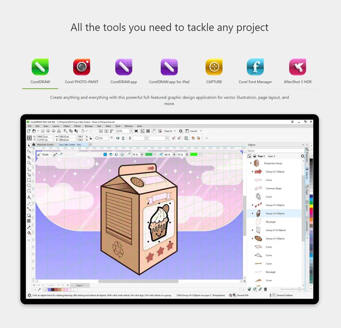 CorelDRAW® Graphics Suite is your fully loaded, professional design toolkit for delivering breathtaking vector illustration, layout, photo editing, and typography projects with total efficiency.